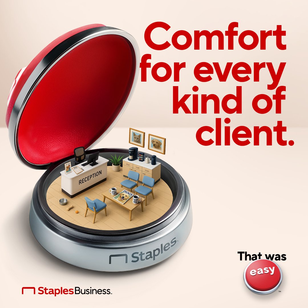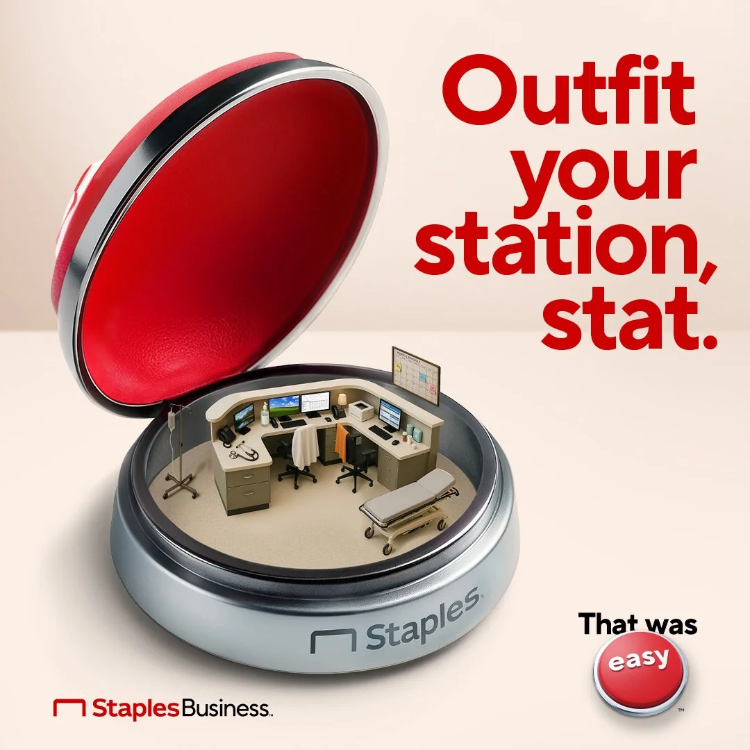 AI artistry was used to meet the extremely tight production schedule vs traditional methods. Using precise product references and AI image generation, the Easy Button was modeled in high resolution, then digitally hinged open to reveal immersive, to-scale worlds inside. Each interior scene—whether a tech repair desk, a tire centre a school classroom, or a clinic reception —was rendered with rich textures, realistic lighting, and category-specific props to feel both authentic and delightful. The juxtaposition of the sleek, familiar exterior with the unexpected, fully realized environments inside created a visual metaphor for Staples as more than office supplies—positioning them as a complete solutions partner for every kind of workspace.